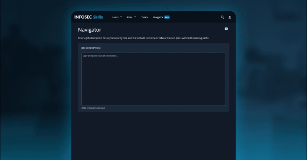 With the Infosec Skills Navigator, creating a personalized training plans for your team is as easy as inputting a job description, task list, or desired skills.